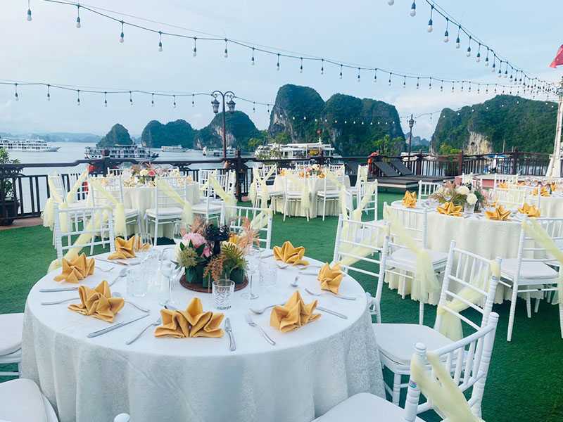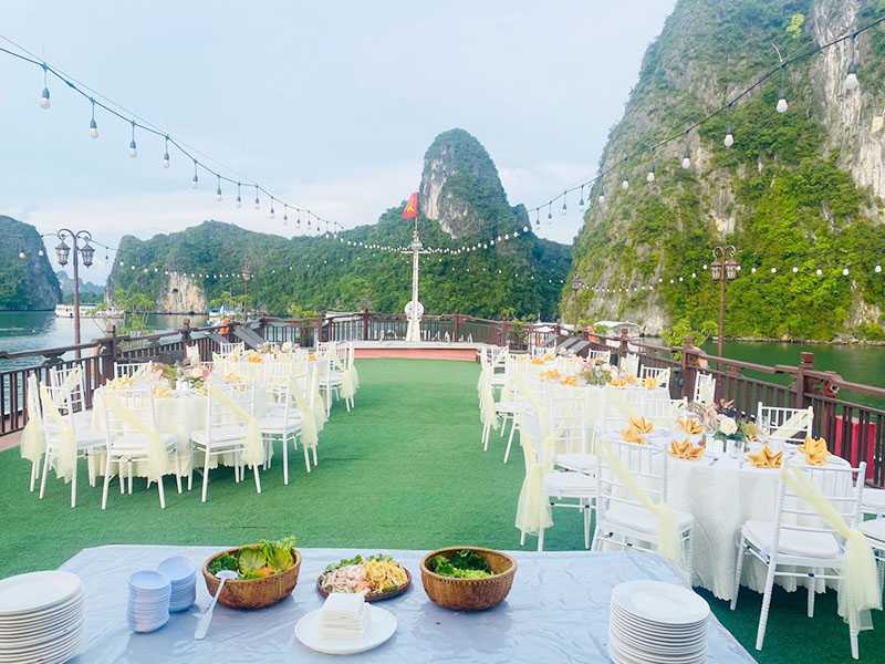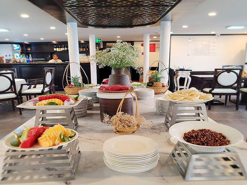 17:30 - 18:00 - Back on board, you will join the Sunset Party and Cooking Class while the ship heads toward the shore. Guests can enjoy relaxing moments while sipping a cup of traditional Vietnamese tea or coffee on the sundeck amidst stunning views and a beautiful sunset. Halong Bay is quiet during the day, but when the sun goes down, the bay becomes even more tranquil and peaceful.
