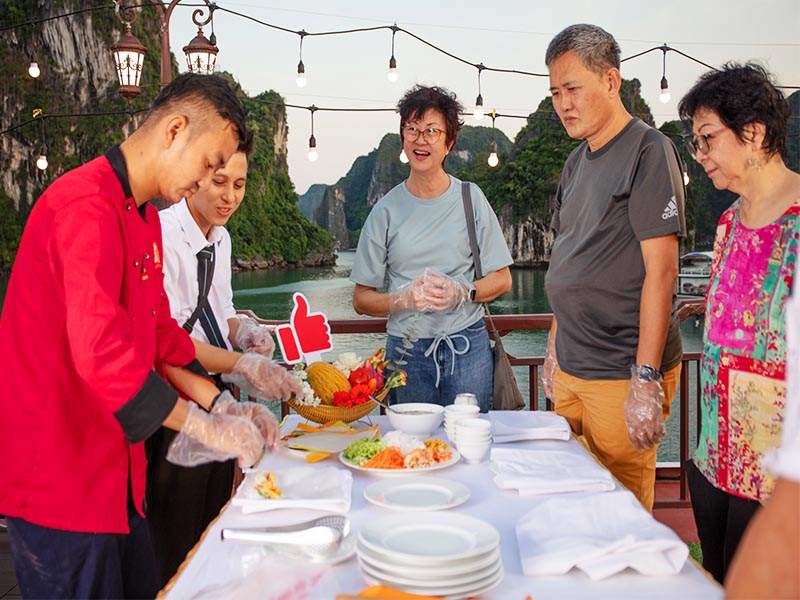 17:30 - 18:00 - Back on board, you will participate in a sunset party and cooking class while the vessel cruises toward the shore. You can enjoy relaxing moments while sipping a cup of traditional Vietnamese tea or coffee on the sundeck amid wonderful scenery and beautiful sunset. Ha Long Bay is calm during the day, but when the sun goes down, the bay becomes even more tranquil and peaceful. You will be instructed to make delicious fresh spring rolls by our chef and then enjoy the rolls made on your own.