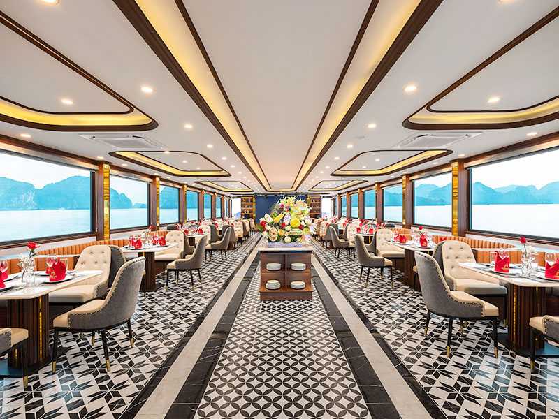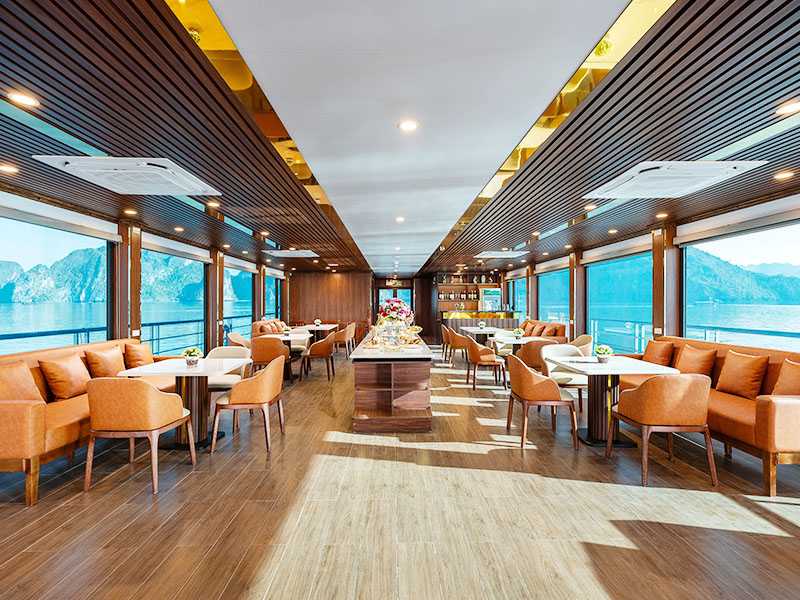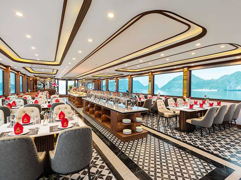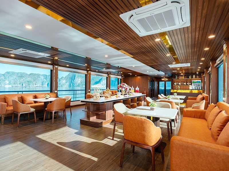 11:30 - 12:00 - When arriving at Halong International Cruise Port you are welcomed with a nice smile from our staff, you will check in, get on the board, enjoy a welcome drink, when the manager or tour guide introduces the itinerary before discovering Halong Bay.