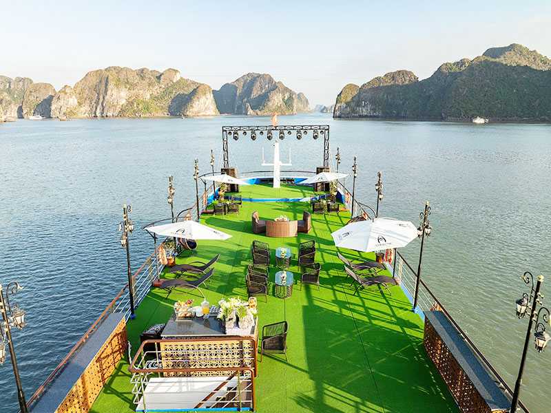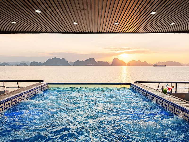 16:30 - After that, you will get back to the cruise and be ready for our Sunset Party. Vietnamese tea, cake, fresh fruits, and snacks will be served while you're relaxing on the sundeck or in the infinity pool. The cruise will pass by the islands of Ha Long Bay on the way back.