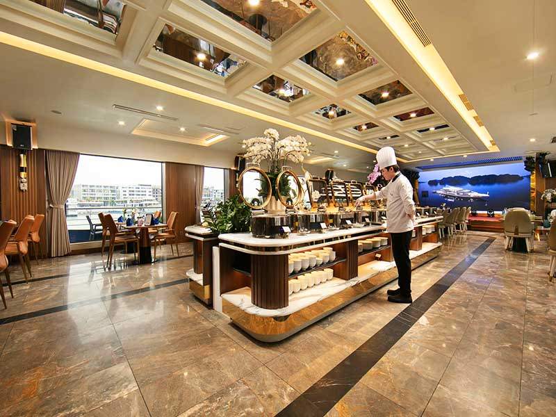 13:00 - Savor a carefully curated gourmet menu crafted by talented Vietnamese culinary experts at the elegant Bayview Dining Restaurant. Guests can indulge in exquisite dishes while enjoying the open-air ambiance and admiring iconic landmarks such as Hoa Cuong Fishing Village and Finger Islet as the cruise glides through the breathtaking Halong Bay.