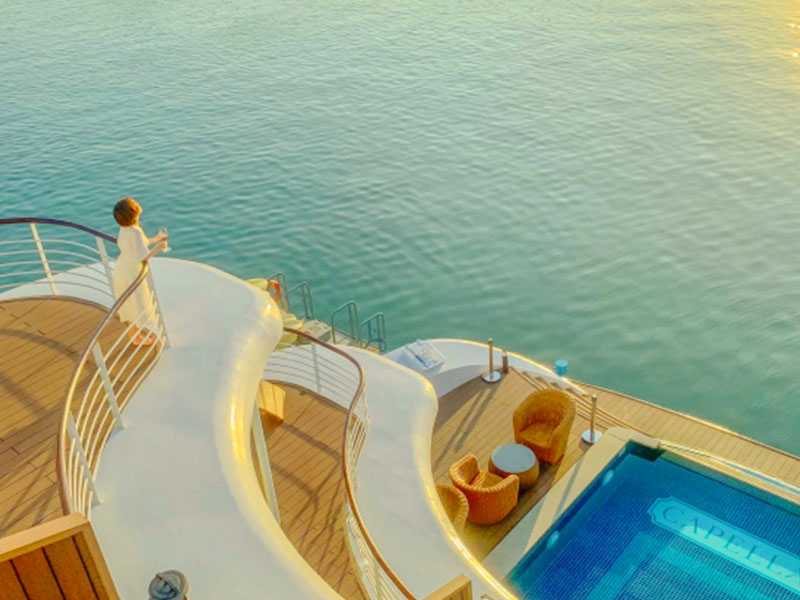 15:15 - 16:30 - Cruise anchorsat Frog Lagoon area for outdoor activities. Access to Capella’s high-grade entertainment facilities for loads of fun water activities. You can choose to rejoice in Infinity Oasis Pool and Jacuzzi, experience the thrills with Inflatable Water Slide,swim in the green emerald water,kayak/try SUP around the beautiful landscape of Lan Ha Bay, or try a Mini-Golf on the top deck.