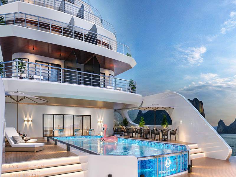 Diana Cruise, the newest 5-star super cruise launched on 15 November 2025, brings a new level of refined elegance to Halong Bay. Featuring 56 balcony suites, a four-season infinity pool, a panoramic restaurant and sky bar, and a modern gym overlooking the limestone karsts, Diana Cruise is designed as a true floating sanctuary. Wake to emerald waters, dine with sweeping ocean views, and relax across five beautifully crafted decks. From sunset canapés to starlit fine dining, every moment aboard Diana Cruise is curated for unforgettable luxury.