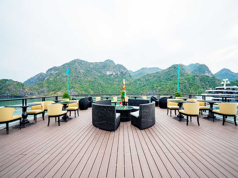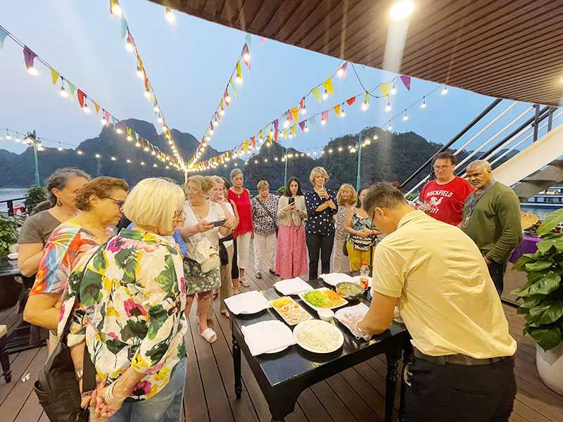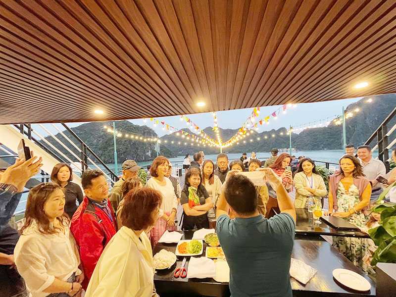 17:00 - We return to Dragonbay Premium Cruise and join some interesting activities such as cooking demonstration, sunset party and relaxing on the sundeck to catch the daily spectacular of a gorgeous panorama. Don’t miss the Happy Hour at our bar as well. After that, the captain will let the cruise stop at a quiet area of the bay.