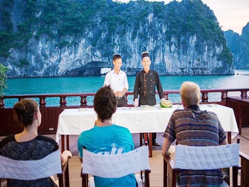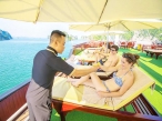 13:15 - Have lunch onboard, savoring fresh and delicious seafood dishes of Ha Long. The cruise starts its journey to explore Bai Tu Long Bay.