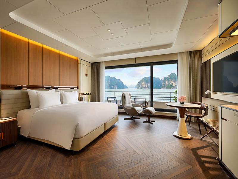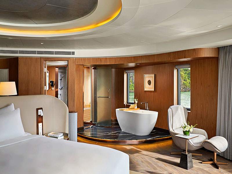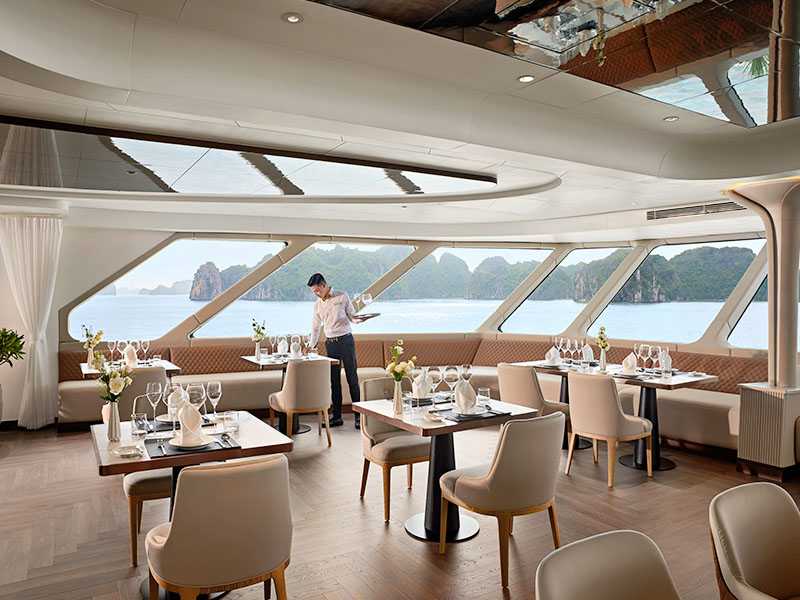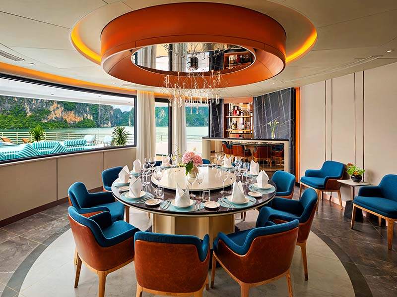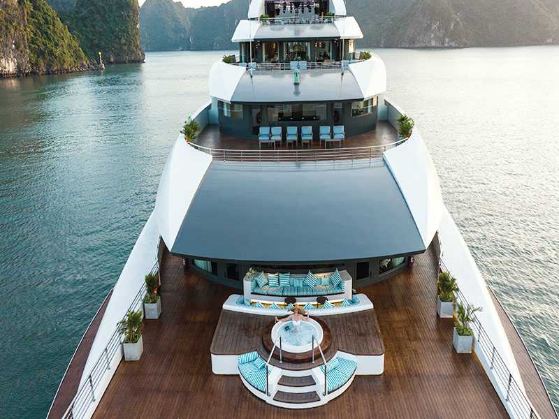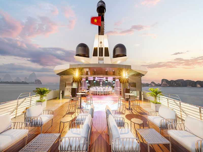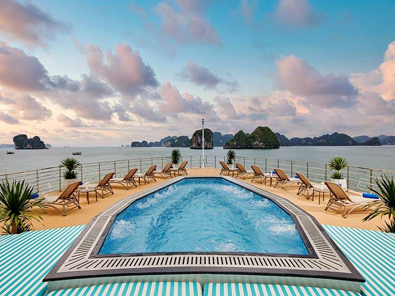21:00 - After dinner, chill out in your suite; pamper yourself at the spa; experience squid fishing back of the boat on the first floor; or spend time with your fellow companions at our cigar and wine lounge, karaoke club, sky bar or the pool bar. Overnight on the Grand Pioneers Halong Bay Cruise.