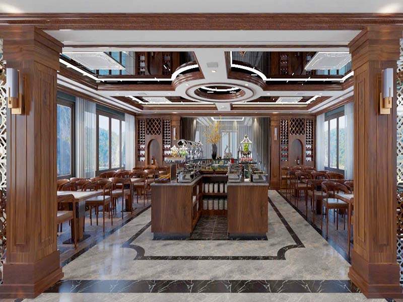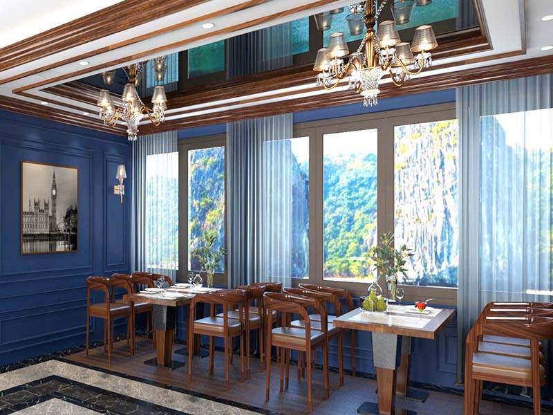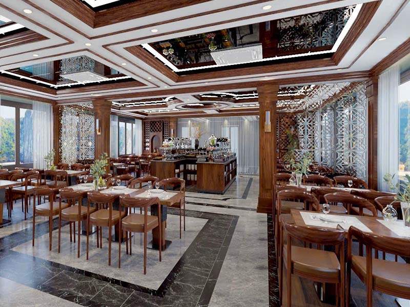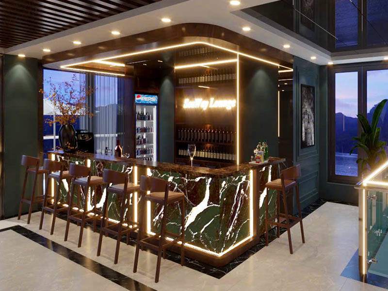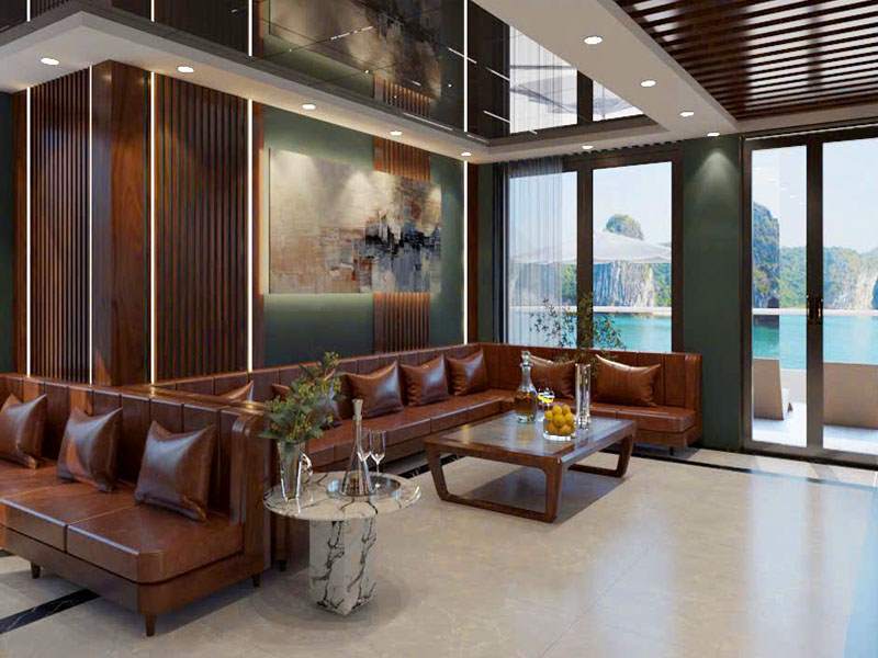 As you step onto the deck, you will be greeted by a lion dance - a symbol of good luck before the voyage. Enjoy a refreshing welcome drink in hand as you get ready for a 7.5-hour journey to explore the stunning Ha Long Bay and Lan Ha Bay. As the cruise departs, a majestic natural panorama unfolds before you - where countless limestone islands such as Duck Islet and Finger Islet rise from the emerald waters, looking like masterpieces sculpted by the hands of nature between the sky and the sea.