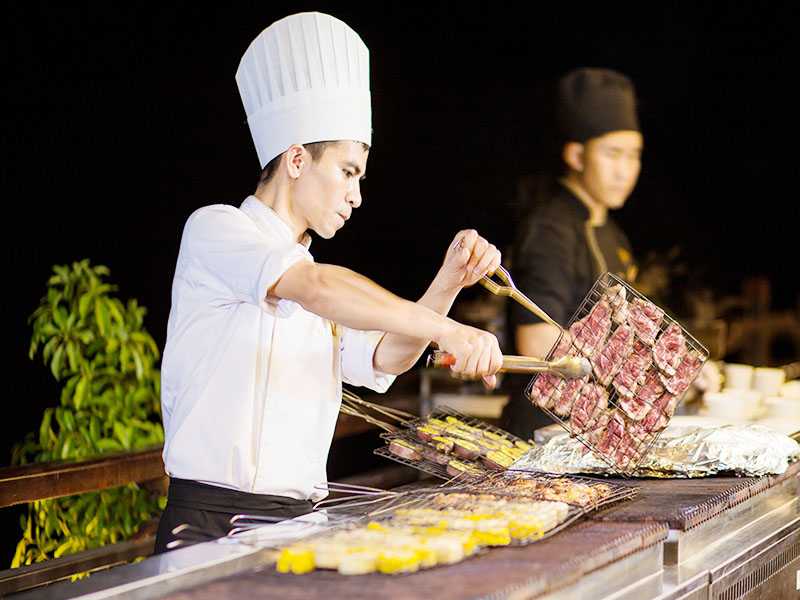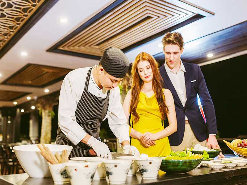 19:00 - If the weather permits, enjoy dinner on the sundeck or in Ha Long Bar & Restaurant, which is on the second floor. You will have the chance to savor meals produced from premium, fresh ingredients in a distinctive fusion style that fuses the essence of traditional Vietnamese cuisine with the innovative influences of modern cuisine.