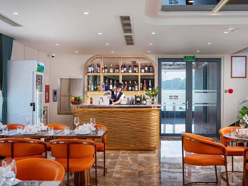 10:30 - Enjoy a refreshing welcome drink as you immerse yourself in the breathtaking world of natural wonders. Admire the majestic limestone mountains rising from the emerald waters of Halong Bay.