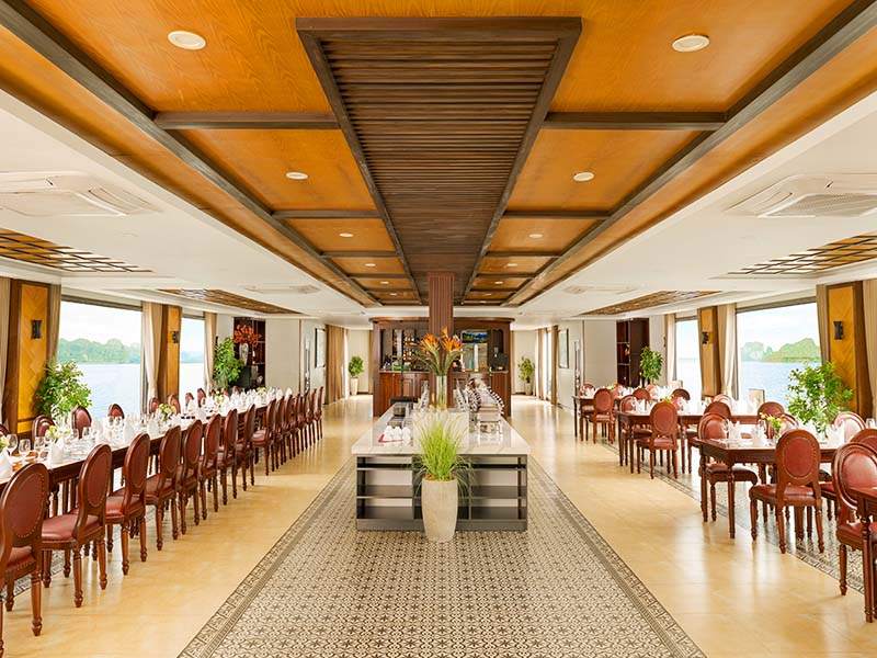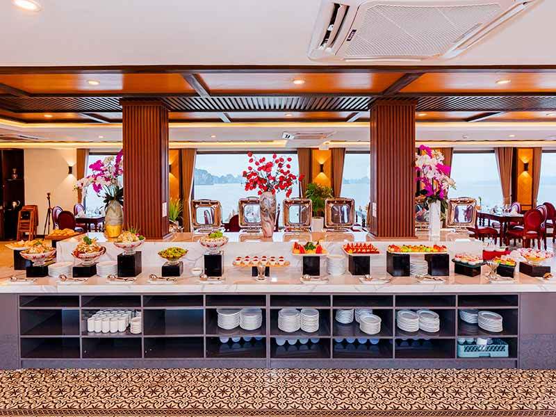 13:00 Savor a delightful lunch at the onboard restaurant, featuring distinctive culinary flavors. As you dine, the cruise gently sails past beautiful sites such as Elephant Leg Islet, Tra Bau Fishing Village, and countless uniquely shaped limestone karsts.