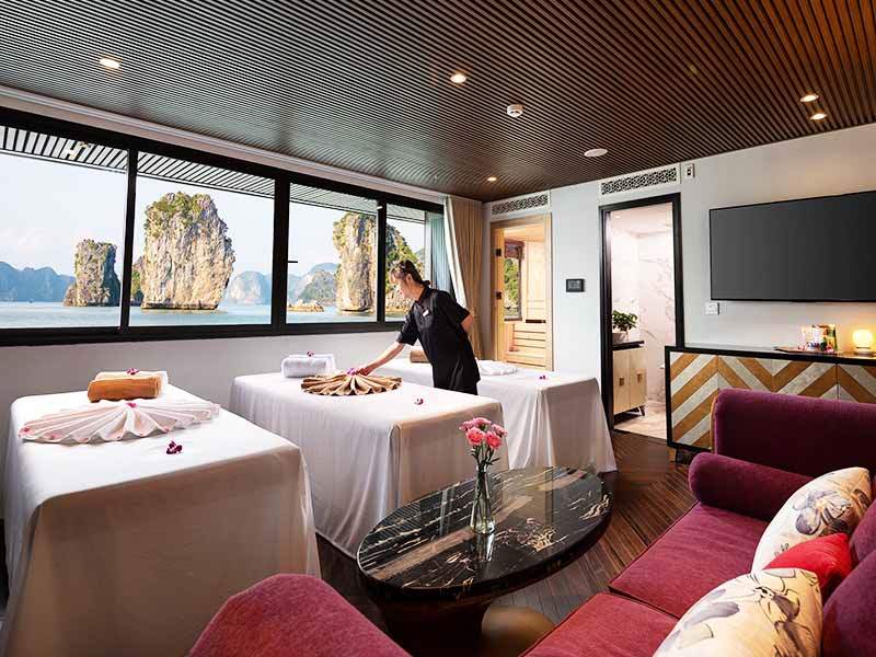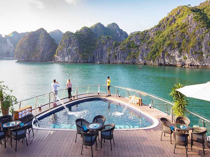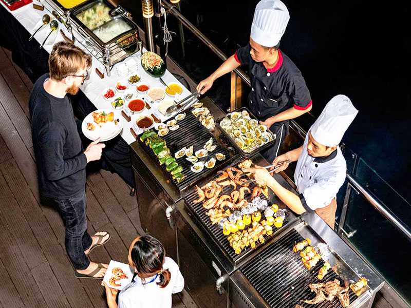 - All meals on board: 01 set western lunch, 01 fine dining BBQ swimming pool dinner, 01 light breakfast and 01 Vietnamese menu brunch
