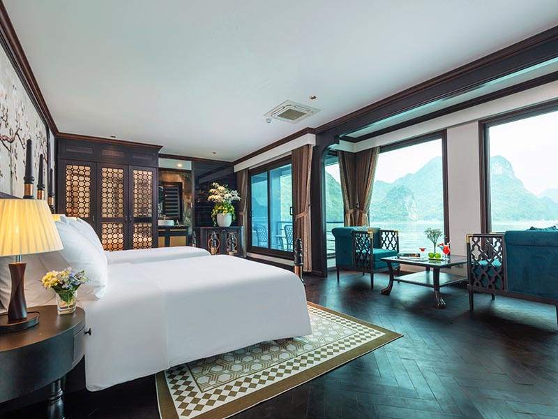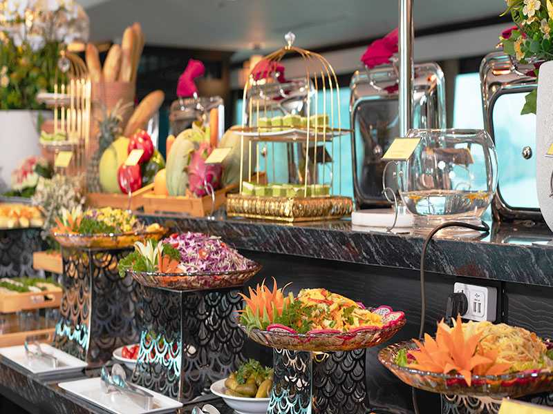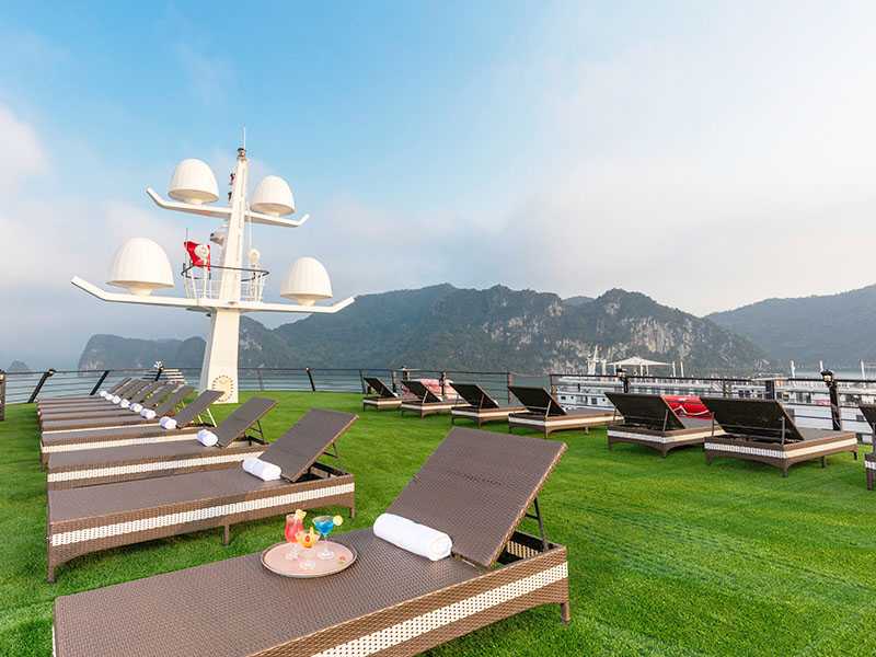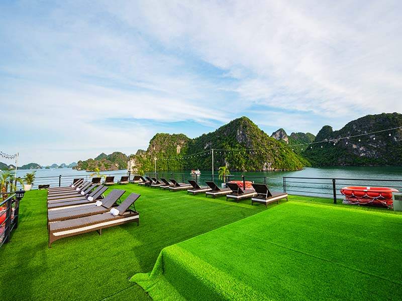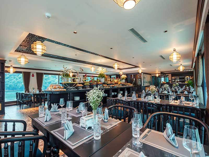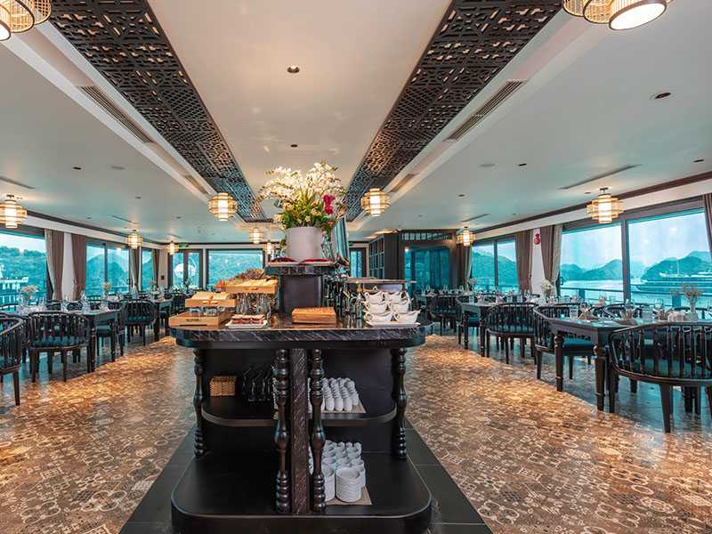 13:15 - Enjoy afabulous lunch in our restaurant. During lunch time, our cruise starts to sail through the magnificent Lan Ha Bay, a geological extension of Halong Bay which is less visited, less inhabited and therefore has the extra appeal of being a more peaceful place. After lunchtime, you will have a short break before joining the first activity of the tour.